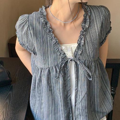 여성 스트라이프 레이스 프릴 반팔 블라우스 MSE-WBL-20761-블랙