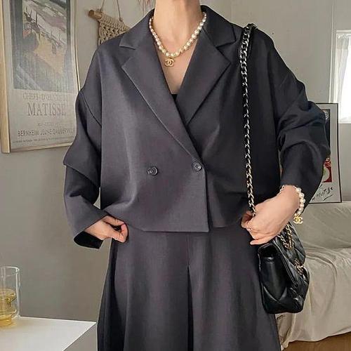 정장코트 여성 춘추 신상 루즈핏 단색 V넥 뒤트임 디자인 상의 오피스룩 패션 고급 오버사이즈 어께패드 있는 비즈니스 정장 재킷