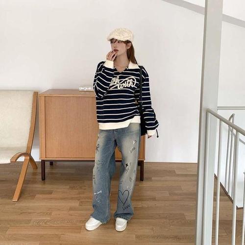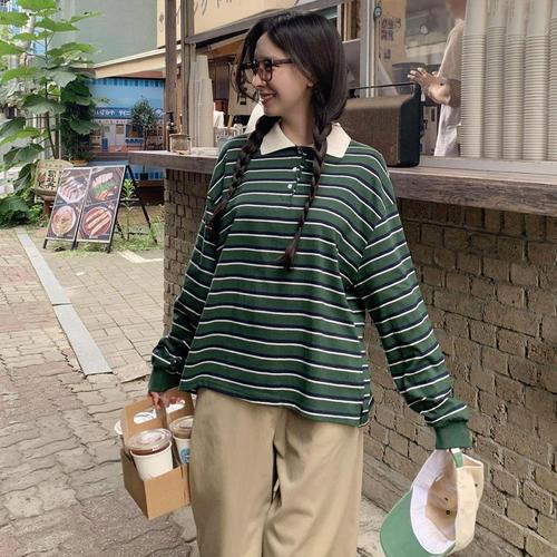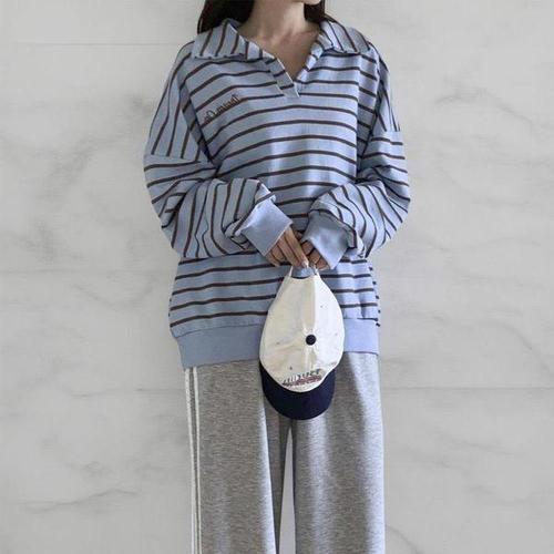 [다잇템]여성 키치무드 빅사이즈 줄무늬 카라넥 티셔츠