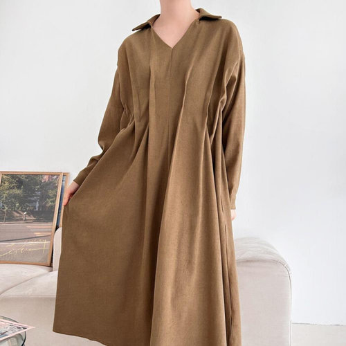 옷자락 / 여자 빅사이즈 브이 카라넥 핀턱 겨울하객룩 롱원피스