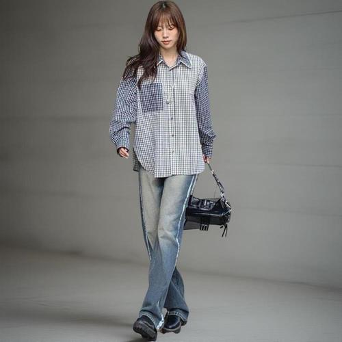 [다잇템]여성 레이스 포켓 대형 격자 빅사이즈 블라우스