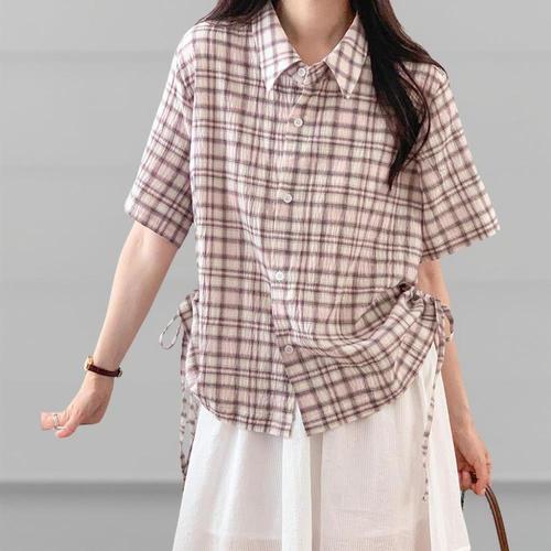 [미라클세븐]여성 체크 남방 빅사이즈 사이드 셔링 스트랩 투웨이 반팔 셔츠