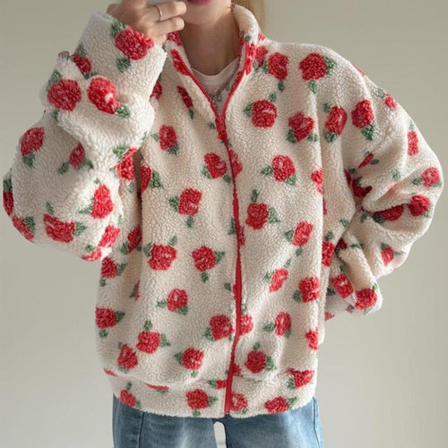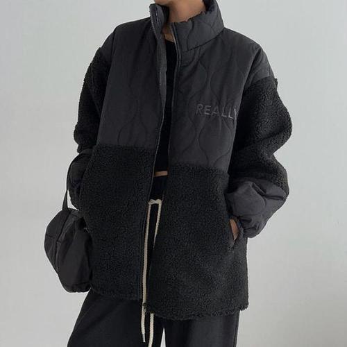 [옷자락]여성 빅사이즈 퍼플라워 컬러 배색 하이넥 양털 점퍼
