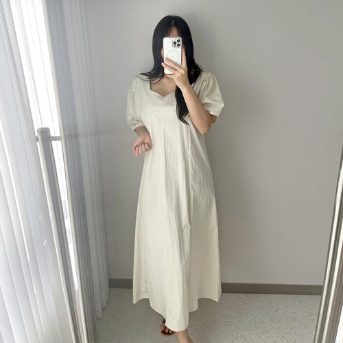 글램핏 / 퍼프 하트넥 루즈핏 빅사이즈 여름 임부복 데일리 반팔 롱 원피스 2컬러