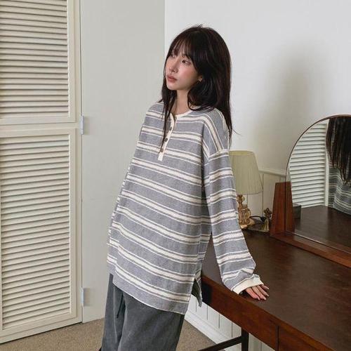코코세븐 헨리넥 스트라이프 루즈핏 반오픈 빅사이즈 라운드넥 긴팔 니트 티셔츠