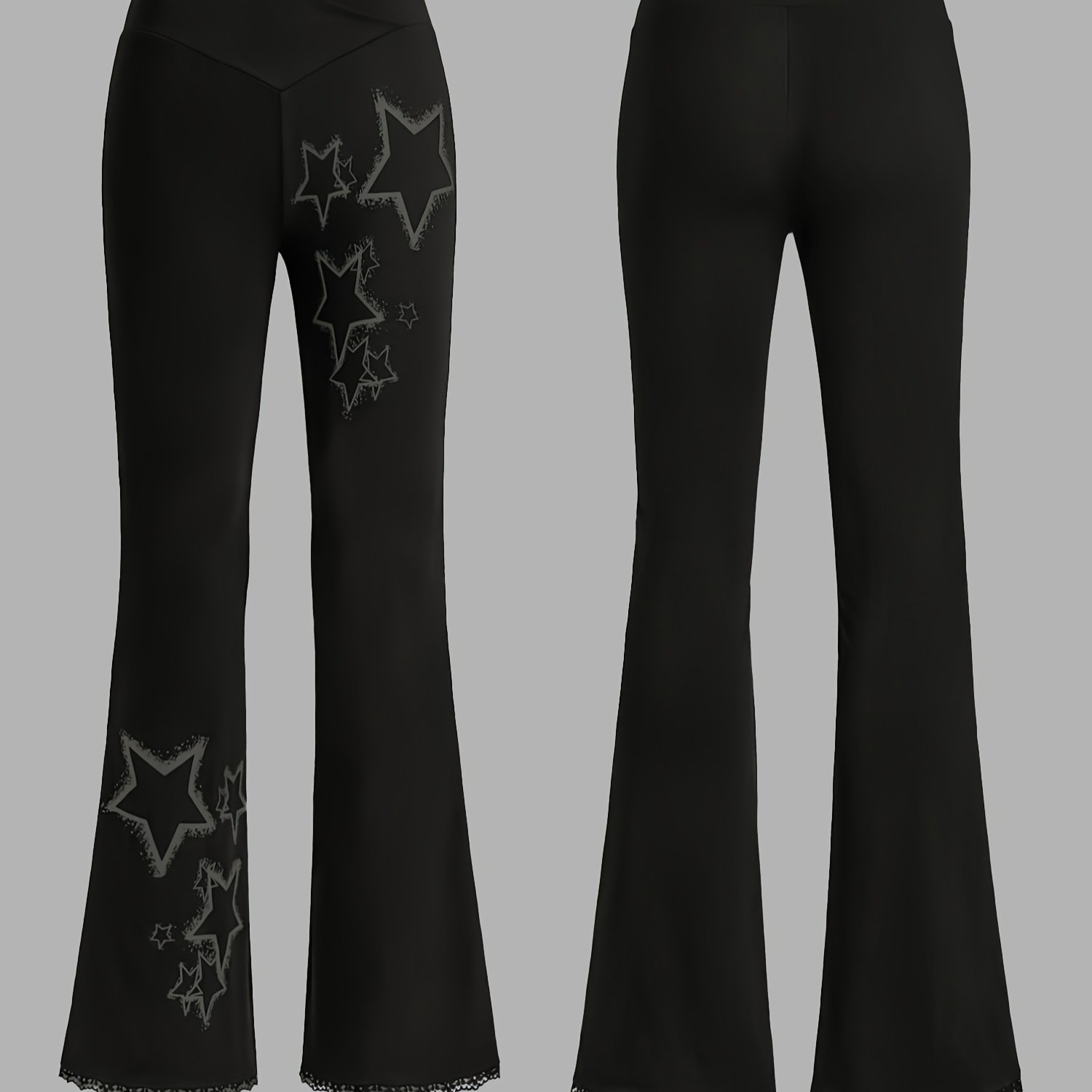 TEMU 1pc 여성용 캐주얼 벨 바닥스, 라인스톤 스타 액센트 - 하이 웨이스트 플레어 레그 팬츠, 블랙 여름 트라우저, 레이스 디테일링, 편안하고 스타일리시한 캐주얼 의상, 하이 웨이스트 레깅스