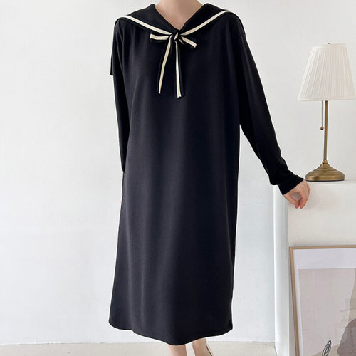 옷자락 / 여자 리본 배색 세일러카라 빅사이즈 기모 롱원피스