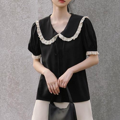 여성 빅카라 레이스 블라우스 블랙 1P 여름 반팔 셔츠 WFHVZH9