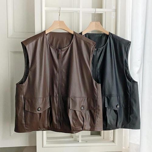 [옷자락]여성 빈티지 레더 더블포켓 스트링 가죽 베스트