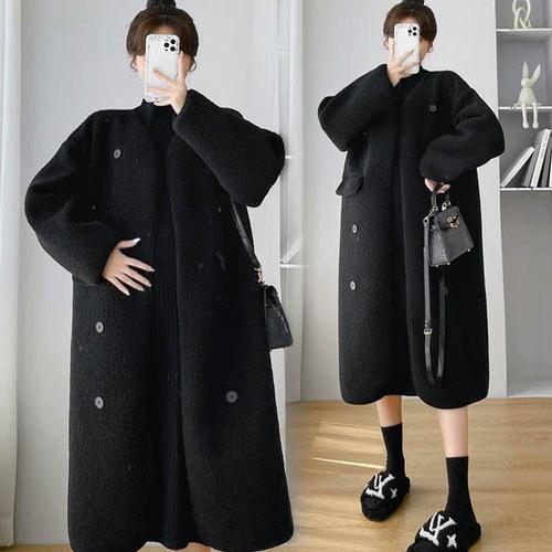 오스틱니 2025 초특가 80kg까지 빅사이즈 여성 가을 겨울용 편안한 날씬해 보이는 뽀글이 무릎 너머 브이넥 롱 후드 코트 아우터 보온 방한 방풍 간절기 외출용 데일리