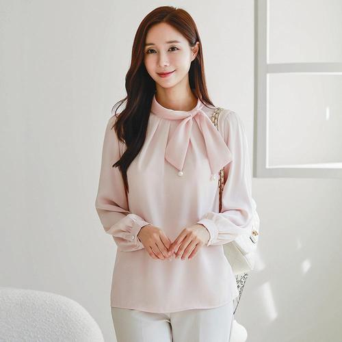 여성 봄 가을 노방 진주 리본 타이 빅사이즈 쉬폰 블라우스 하객 모임 오피스룩 상견례 미시