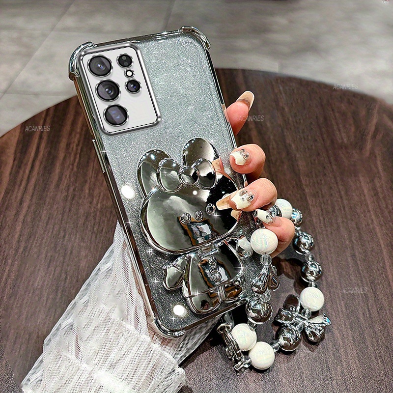 TEMU 폰 케이스: S 25 울트라 럭셔리 도금 충격방지 코너 강화 글리터 카드 폰 케이스, 갤럭시 S25 울트라 호환, 귀여운 미러 토끼 브래킷, 우아한 팔찌 체인, 소프트 TPU 백커버