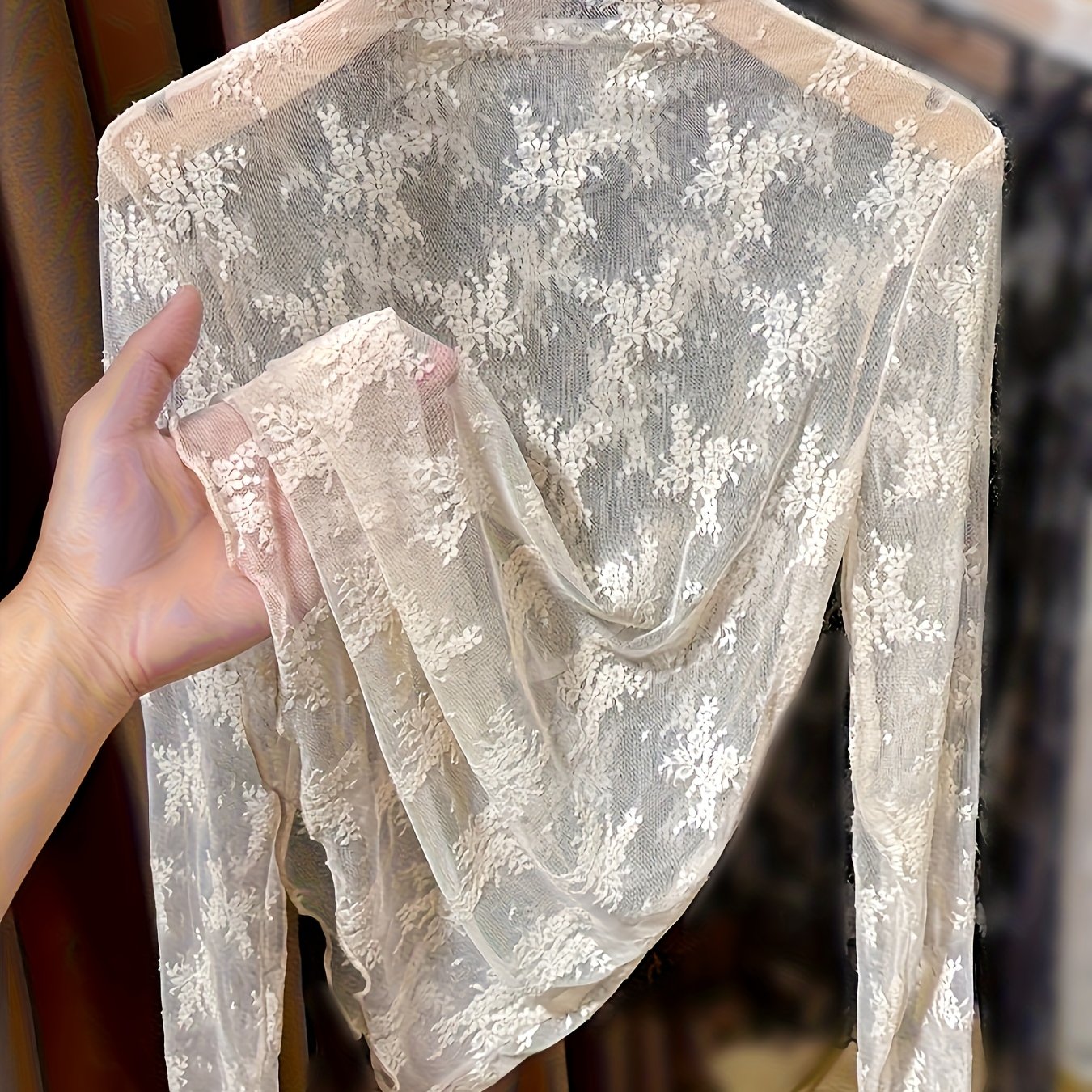 TEMU 여성용 섹시 레이스 긴팔 탑 - 꽃무늬가 있는 시스루 메쉬 블라우스, 가볍고 통기성이 좋은 봄/여름/가을용, 레이어링 또는 단독 착용에 완벽한 레이스 블라우스