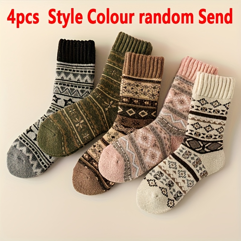 TEMU 4개 여성용 미드 카프 양말 | 가을-겨울용 두꺼운 기모 안감 따뜻한 양말, 매우 두꺼운 원단, 기하학적 패턴, 편안한 디자인, 내구성