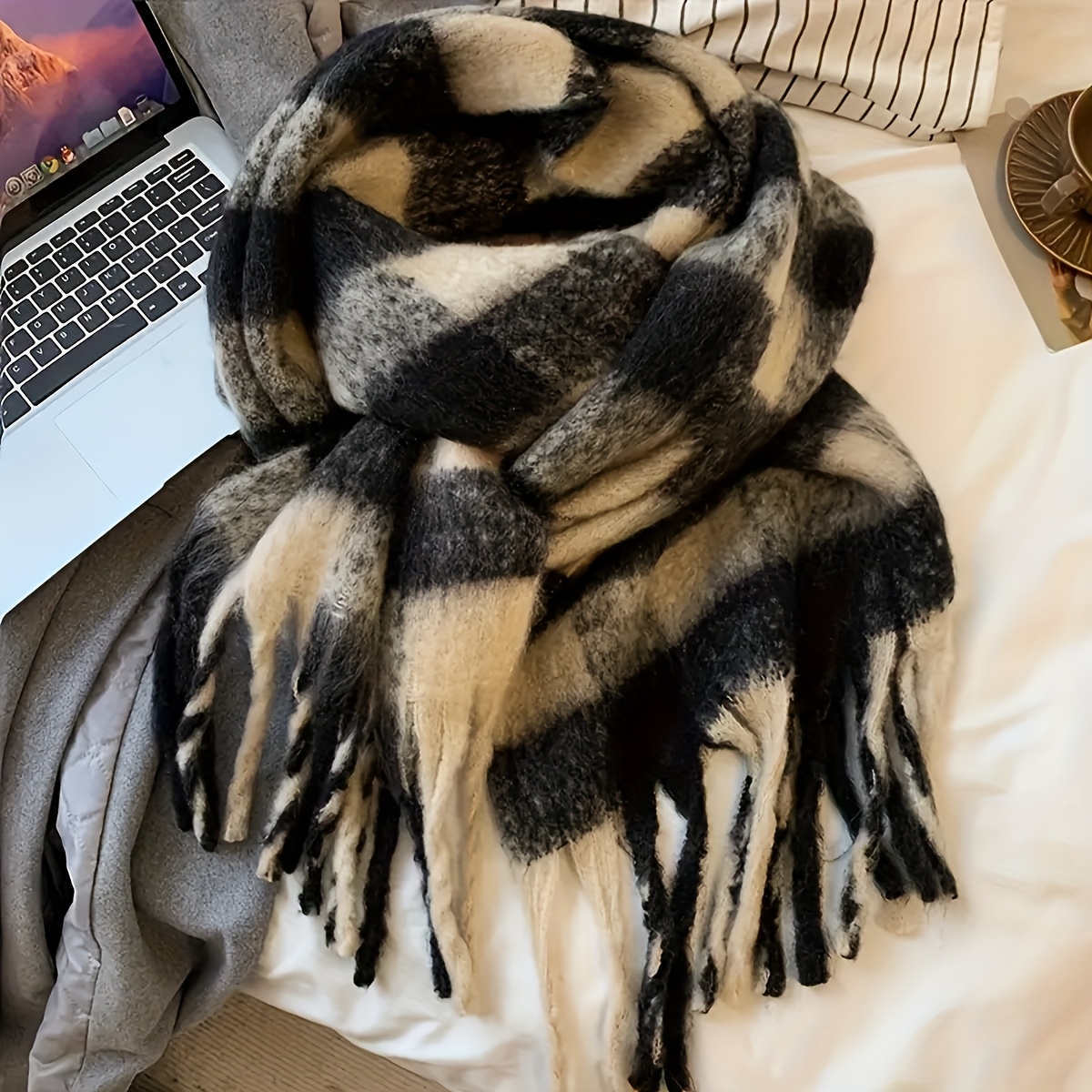 TEMU 【일상적인 편안함】 우아한 블랙 & 화이트 하운드투스 스카프 태슬 포함 - 여성용 포근하고 따뜻한 폴리에스테르 숄 | 가을 & 겨울 외출에 완벽한 스타일리시한 한국식 체크무늬 디자인 | 통기성 좋고 장식적인 액세서리, 손세탁 가능