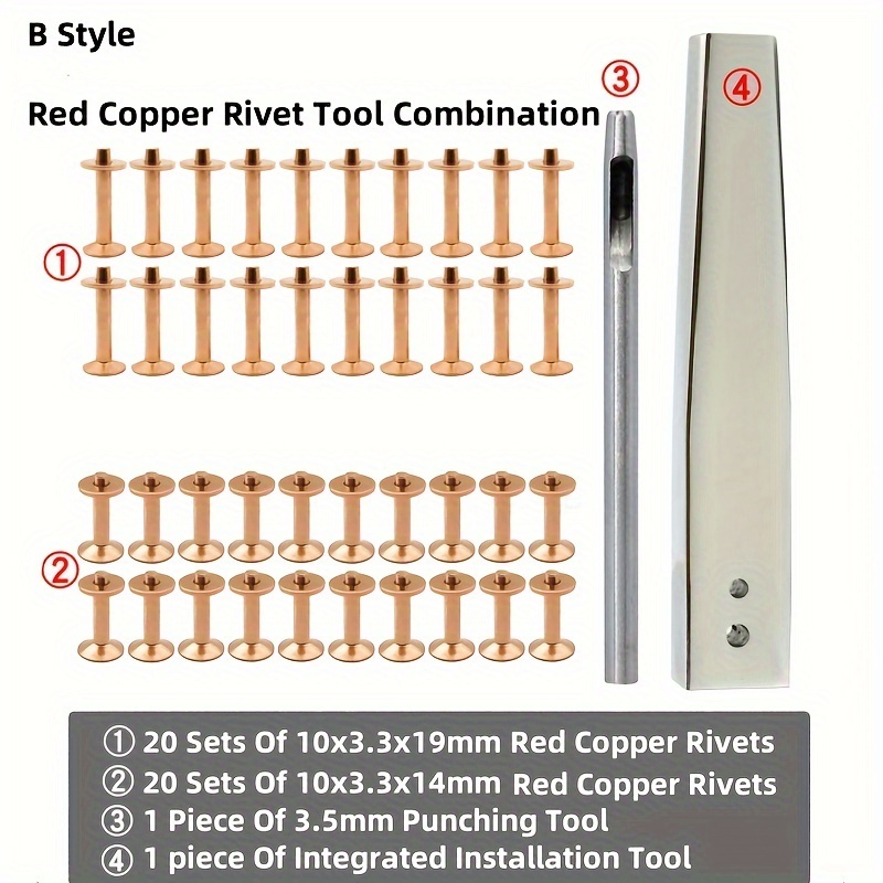 TEMU 40개 단단한 구리 리벳, 가죽 청바지용 레드 구리 못 설치 도구 세트 (영구 철 패턴 리벳 포함), 가죽 공예 도구, 가죽 공예 용품, 가죽