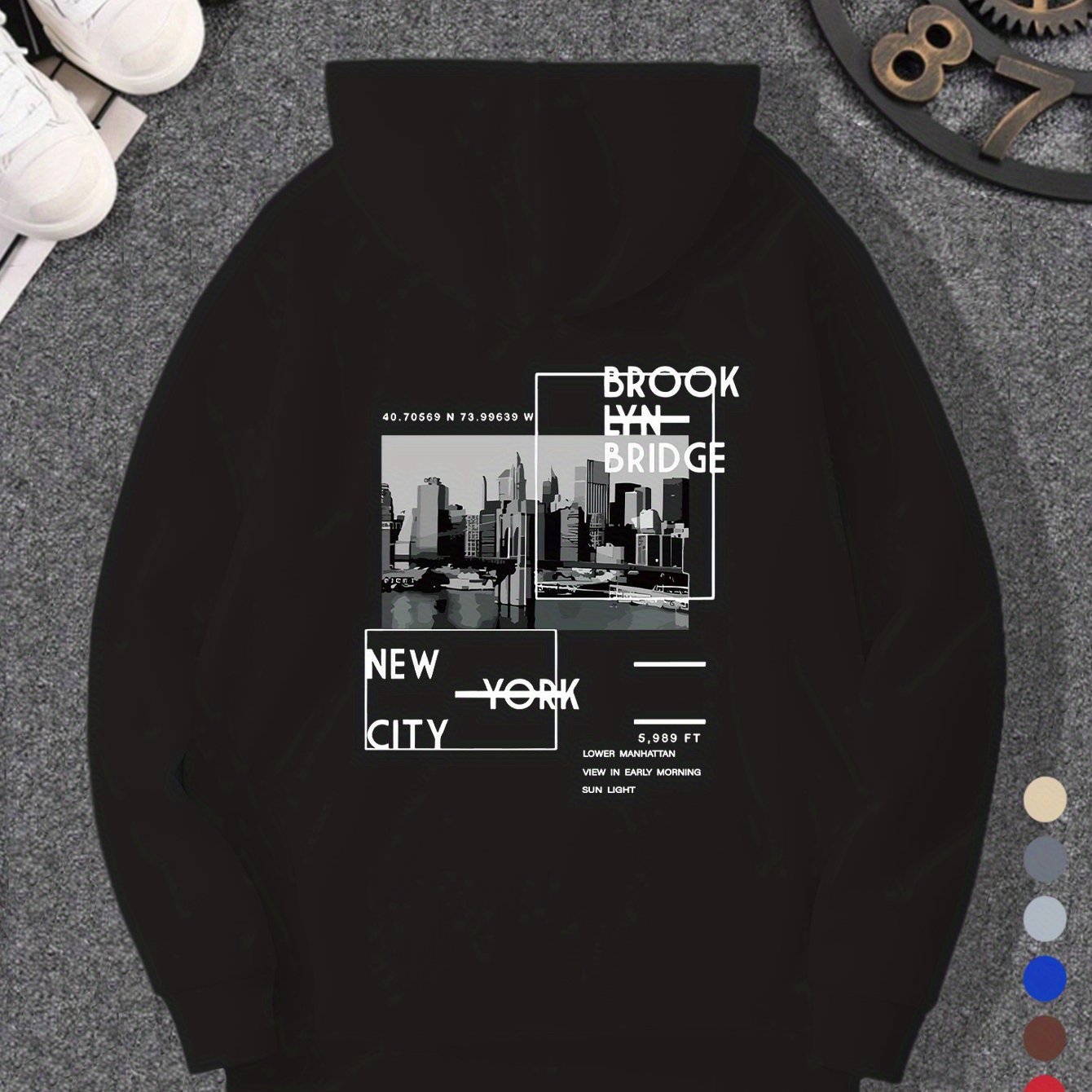 TEMU 뉴욕시 프린트, 문자 그래픽, 니트 폴리에스테르 원단, 레귤러 핏, 드로스트링 후드, 긴팔, 가을/겨울 컬렉션이 특징인 1pc 남성 패션 캐주얼 풀오버 후디