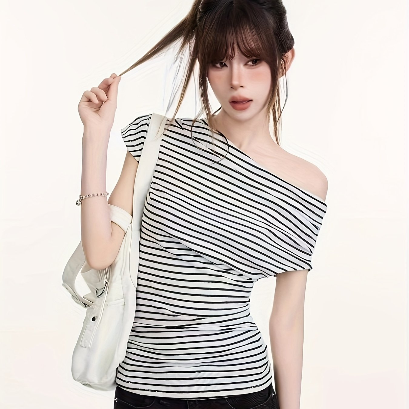 TEMU 여성용 블랙 오프숄더 크롭 탑 티셔츠 - 슬림핏, 허리 집중 디자인, 세련된 여름 스타일, 대비 , 오프숄더 넥라인, 캐주얼하면서도 우아한, 여성용 티셔츠