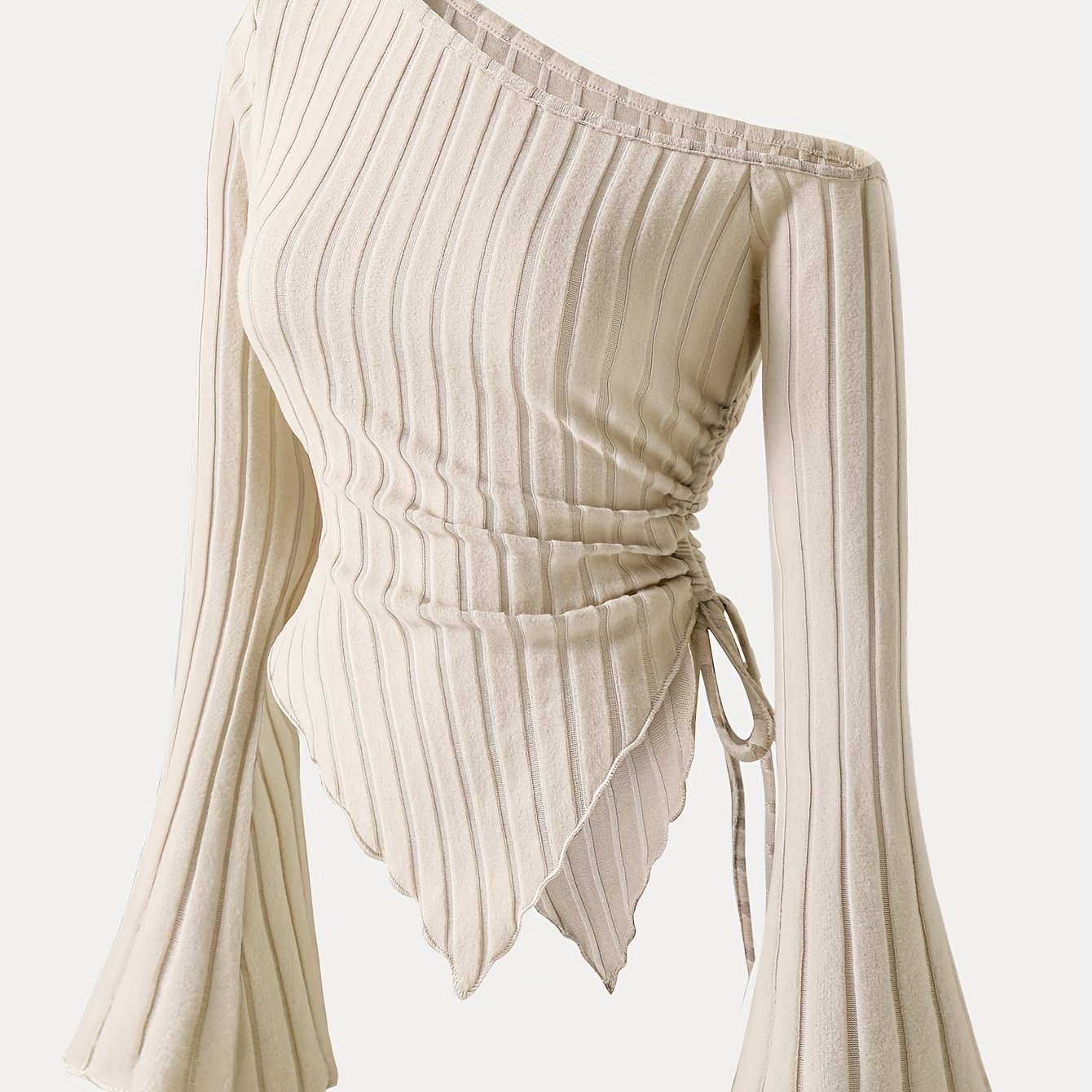 TEMU 팅윤 여성용 우아한 오프숄더 리브드 탑 & 비대칭 밑단 - 베이지 슬림핏 스트레치 티셔츠, 봄/여름 패션, 독특한 숄더 디자인, 편안한 착용감, 세탁기 사용 가능|티셔츠