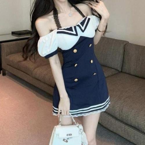 [옷자락] 여성 홀터넥 배색 세일러넥 금당단추 미니 원피스