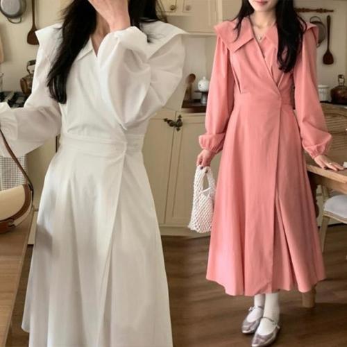 [하프클럽/]여성 레이스 세일러 카라 퍼프 소매 기모 롱 드레스