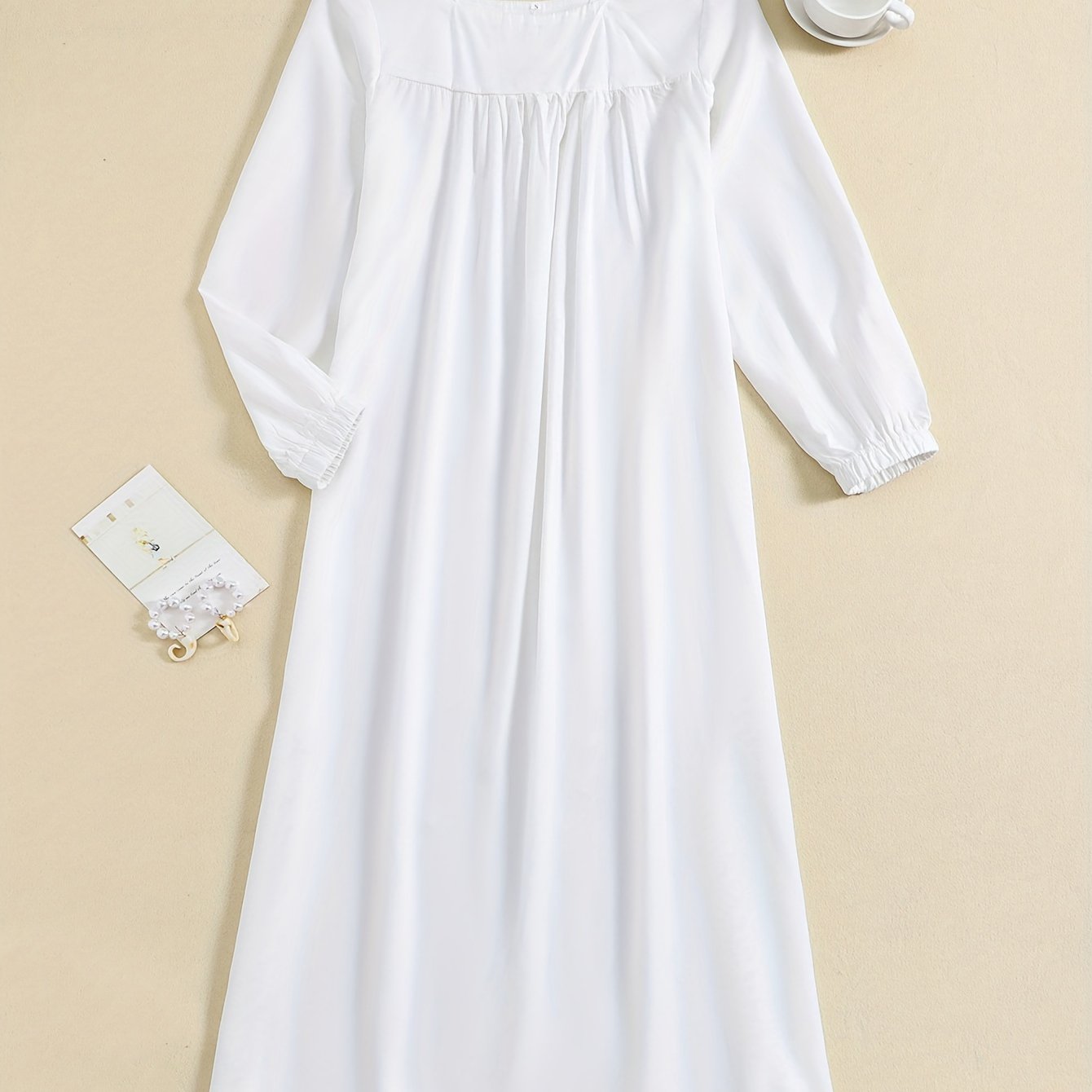 TEMU 여성을 위한 우아한 긴팔 나이트가운 - 단색, 크루넥, 프릴 디테일, 중간 길이 수면 드레스, 편안한 폴리에스테르, 올 시즌 착용, 수면복|로열 스타일|프릴 디테일, 수면복 드레스