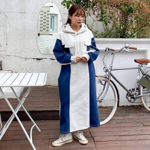 여성 캐주얼 루즈핏 기모 후드 롱 원피스 S348