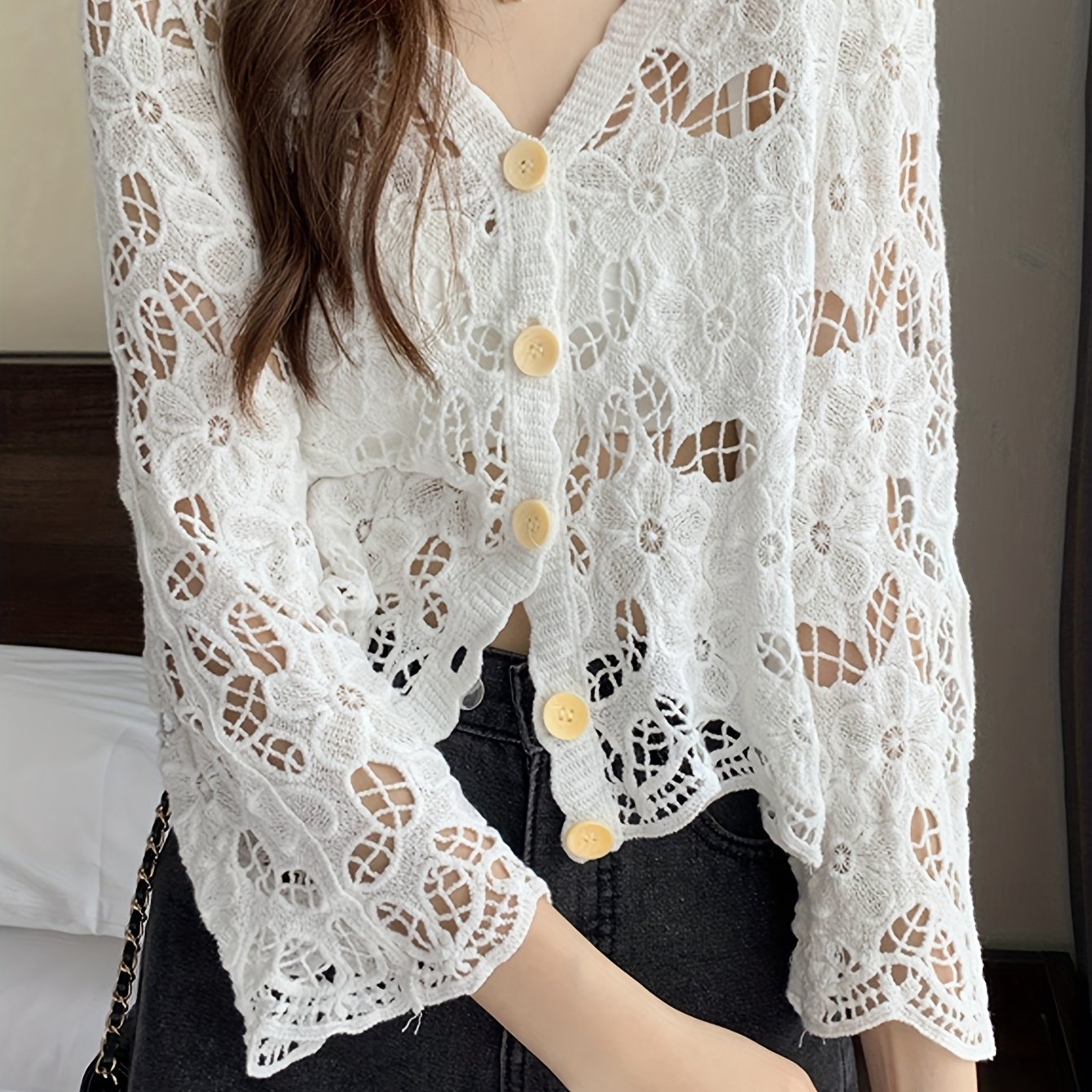 TEMU 여성용 레이스 V넥 가디건 - 버튼 프론트 세미시어 커버업, 3계절 리조트 스타일 탑, 비치 휴가 & 캐주얼 아웃핏을 위한 가벼운 여름 레이어링 피스, 크로셰 텍스처, 우아한 제작