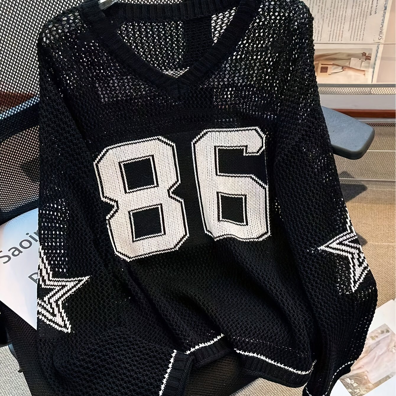 TEMU 여성용 Y2K 탑, V넥 긴팔 풀오버, 디지털 스타 패턴 쉬어 봄/가을 가디건, 캐주얼 레이지 스타일, 집에서나 외출에 적합