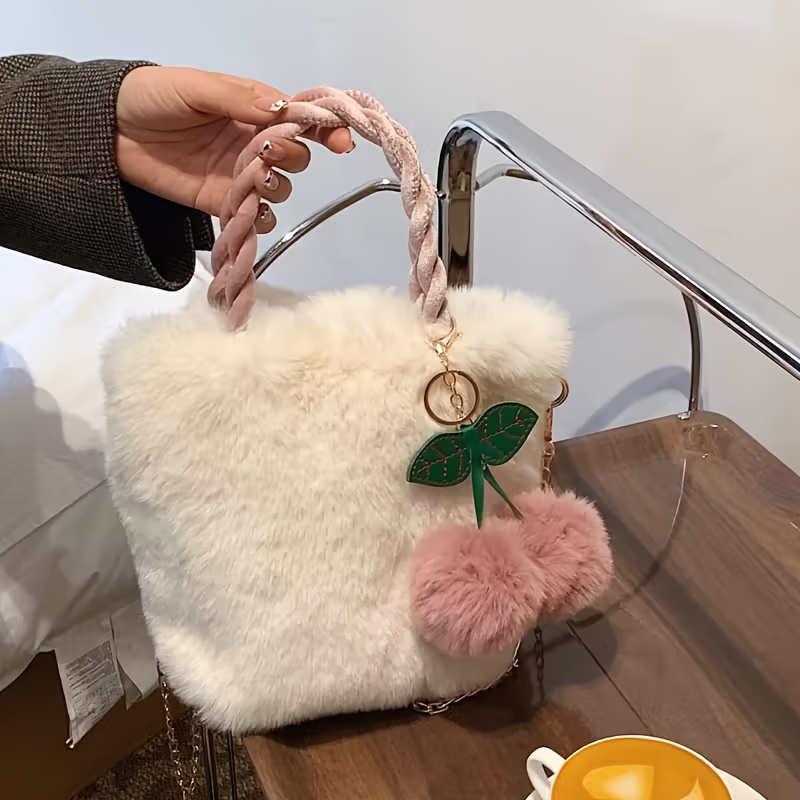 TEMU 여성용 우아한 체리 플리스 크로스바디 백, 자석 버클 잠금 & 조절 가능한 메탈 체인 스트랩 - 대용량 사각 핸드백, 부드러운 모조 밍크 모피 질감, 통근, 쇼핑, 데이트에 적합한 경량 디자인 - 사계절 활용 가능한 선물 (크리스마스)