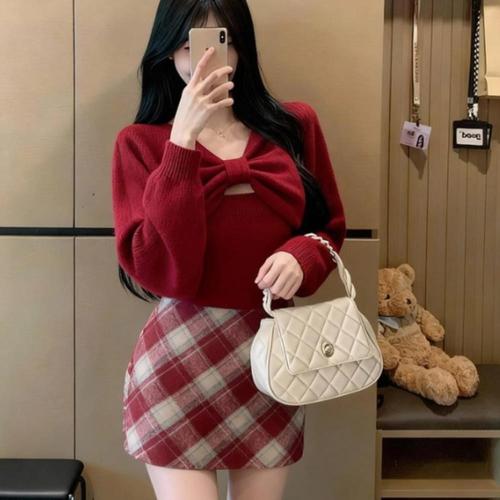 [다잇템]여성 탱크 리본 디자인 스웨터 숏가디건 세트