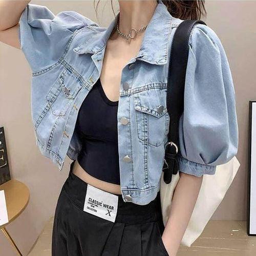 [에이치플러스몰]여자 언발 일상 트렌드 데님 숏자켓 데일리 벌룬 반팔