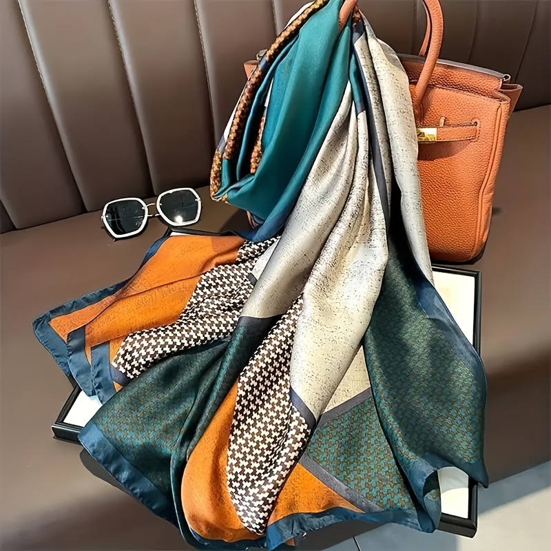 TEMU 기하학 프린트 대형 새틴 스카프 우아한 컬러 블록 숄 랩 여행 비치 타월 액세서리