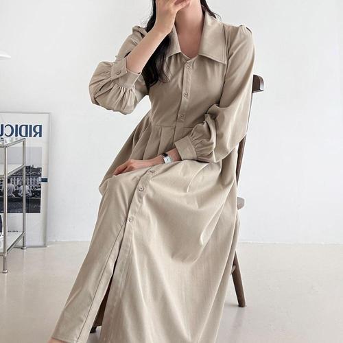 [의류] 여성 코듀로이 골덴 롱원피스 퍼프 소매 V넥 카라넥