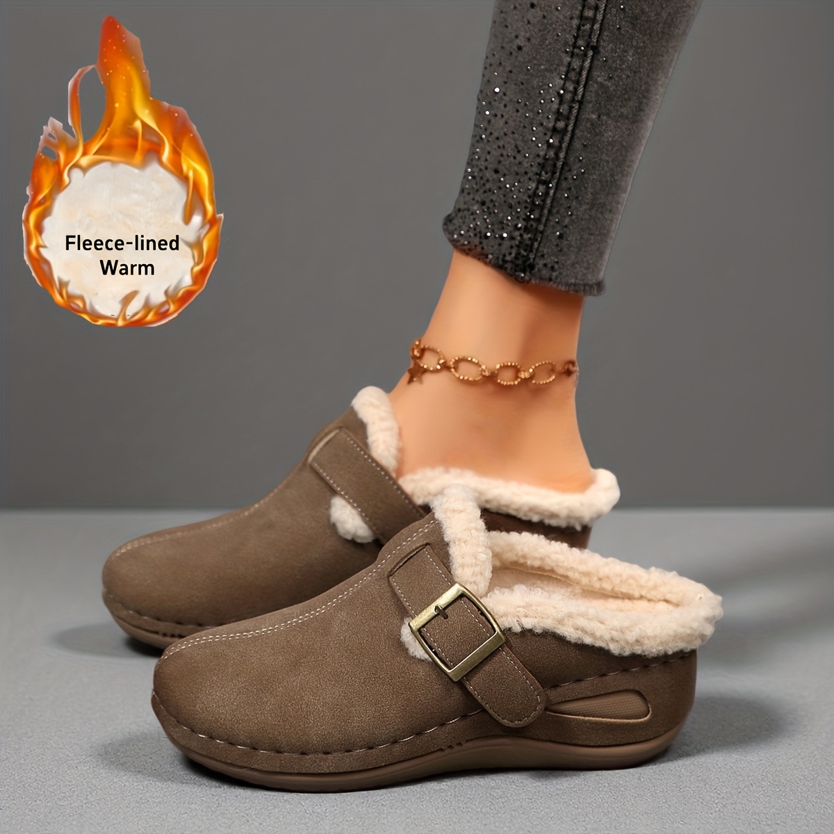 TEMU 여성용 겨울 플러시 기모 안감 슬립온 뮬 - 소프트 브라운레드/ - PU 커버 아퍼 & 아치 지지 플랫폼 힐 - 아늑한 실내/외 신발