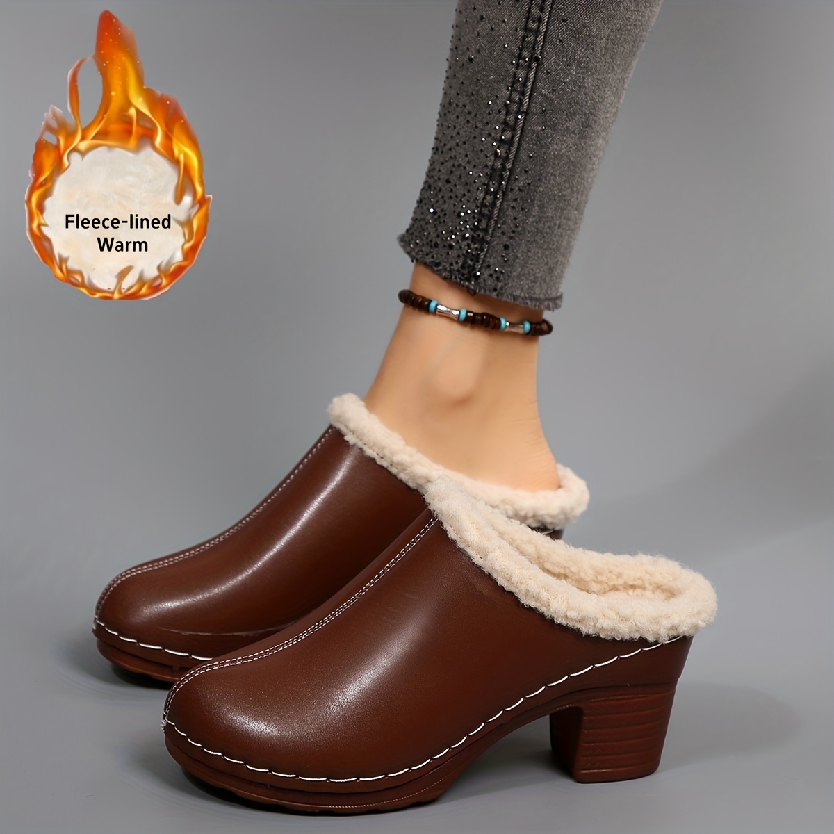 TEMU 여성용 겨울 따뜻한 플리스 안감 슬립온 무울 - 포근한 브라운 둥근 발가락 신발, 플러시 안감, PU 커버 갑피 & 쿠션 깔창, 캐주얼 & 포멀 의상용 블록 힐, 편안한 신발, 스타일리시 슬립온, 오피스 웨어, 圆脚, 여성용 슬립온, 플러스안감, PU커버