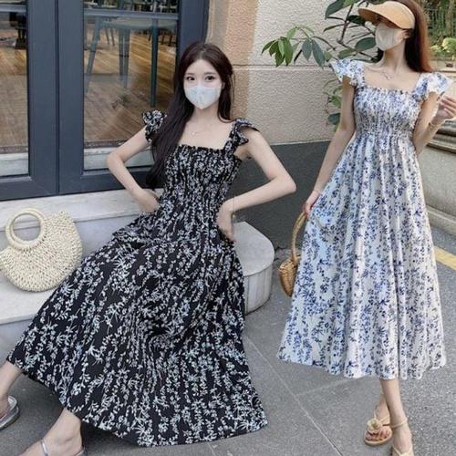 미중 여성 여름 뉴 플라워 끈나시 기질 허리조임 A라인 미디엄 귀여운 원피스 cxcy