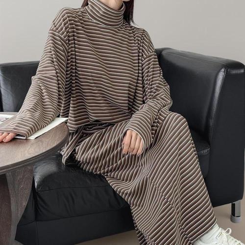 [미라클세븐]여성 빅사이즈 스트라이프 폴라 티셔츠 기모 롱 스커트 세트