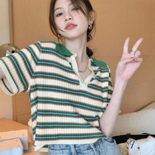 예쁜 여성 스트라이프 크롭 카라 니트 반팔 티셔츠 WC74ABC