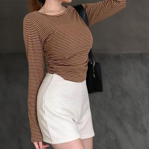 옷자락 / 여성 가을 겨울 기모 스트라이프 세미 크롭 티셔츠