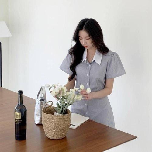 [모노무드]모노무드 퍼프소매 스트라이프 셔츠 미니원피스 A라인 여친룩