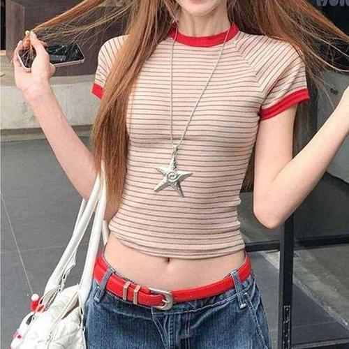 [셀러허브_여성트랜드패션]ONM 여름 크롭 스트라이프 반팔티 여성 캐주얼룩 티셔