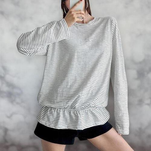 [옷자락]여성 스트라이프 프릴 긴팔 티셔츠 라운드 면 티
