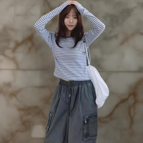 325504 여 저지 보트넥 스트라이프 긴팔티