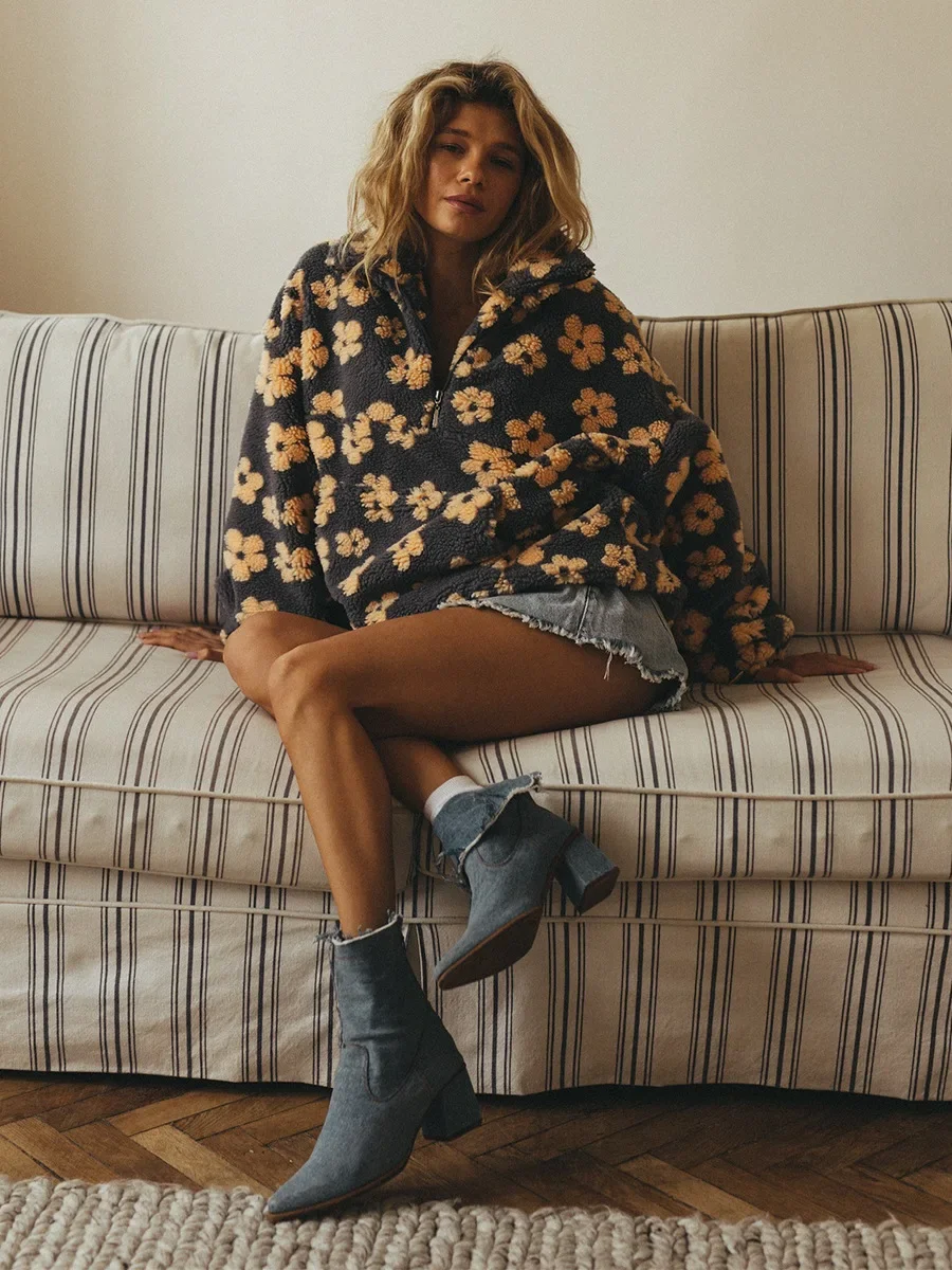 Zekye 여성용 2025 신상 패션 폴라 플리스 꽃무늬 스웨터 면 스웨터 루즈핏 따뜻한 퍼 스탠드업 칼라 지퍼 탑