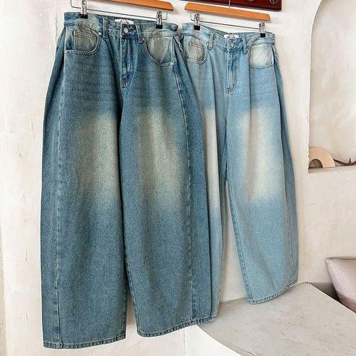 [옷자락]남녀공용 옆주름 맥시 와이드 워싱 데님팬츠
