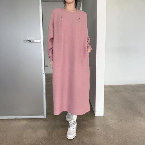 쫀쫀 스판 니트 기모안감 A라인 라운드 롱 원피스