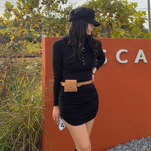 [옷자락] 여자 버튼 후드 슬림핏 스판 긴팔 셔링 미니 원피스