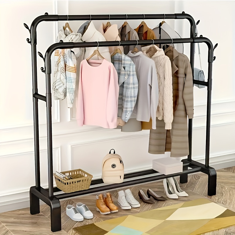 TEMU 1pc 블랙 메탈 독립형 의류 랙, 이중 로드, 대용량, 쉬운 조립, 침실, 발코니, 욕실에 적합 - 150kg까지 견딜 수 있습니다.