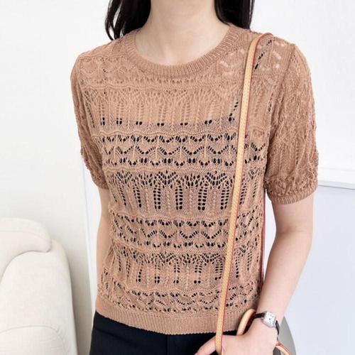 여성 여름 데일리 라운드넥 시스루 펀칭 그물 반팔 니 WFHVZ8X